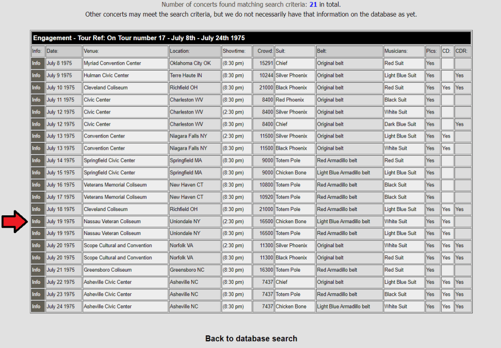 Another highly recommended feature on elvisconcerts.com that might not necessarily be obvious to the casual visitor is the additional information on individual shows available through the databases. Once you have selected the tour you wish to know more about from the ‘Engagement Reference’ dropdown list, or from whichever criteria is your starting point, you can click on ‘info’ to access much more information.
