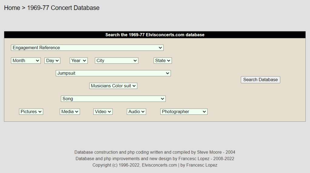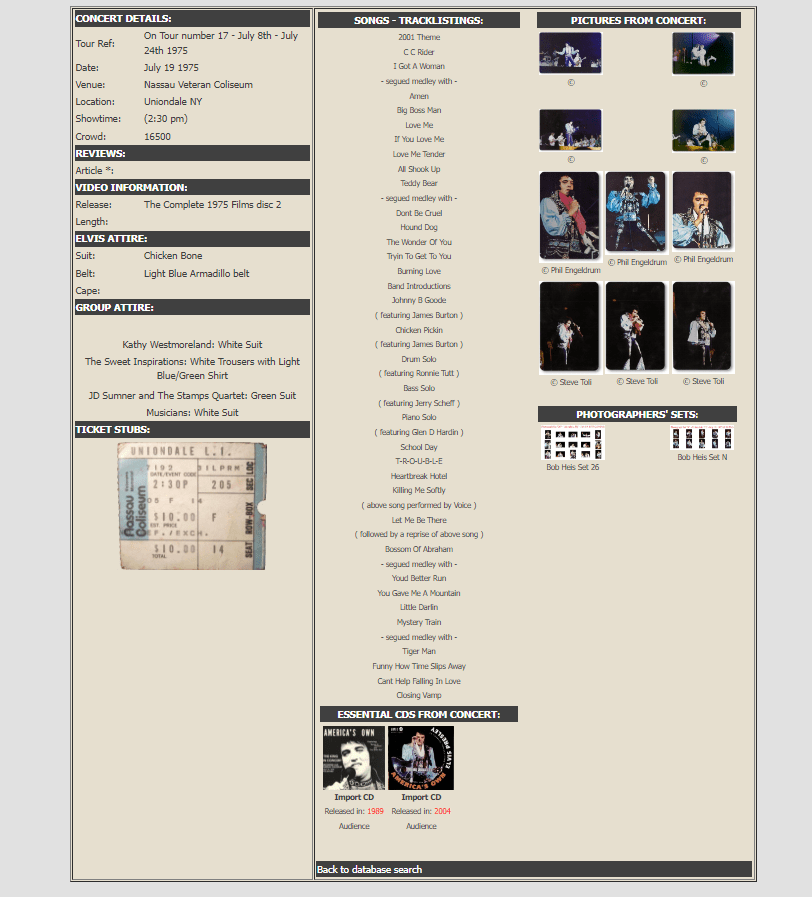 An important part of the website are the databases, which as you rightly said, really set elvisconcerts.com apart. User-friendly navigation tools allow visitors to search information about Elvis’ personal appearances from multiple criteria; with complete tour itineraries, setlists, attendances, venues, details on jumpsuits and belts, the availability of bootleg recordings or amateur vision, and even the stage uniforms for the band. The level of detail and accuracy is mind-blowing. How did you manage to compile and verify all this information, particularly in the early days?