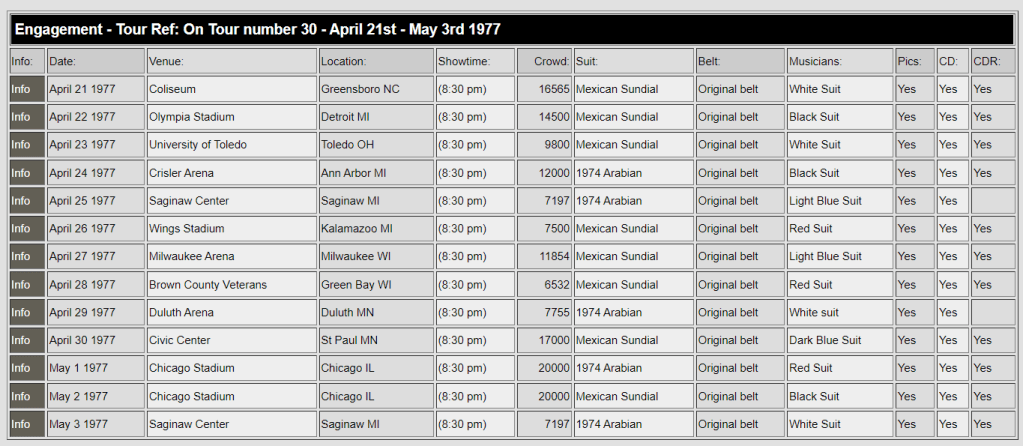 Elvis was suffering from a cold for the St Paul performance, he mentions this with his usual self-deprecating humour during the band introductions. For some additional context and comparison in relation to Elvis’ performances during the tour, you can find an audience recording of Elvis’ April 25th show at Wendler Arena, Saginaw, Michigan, here. He was clearly feeling much better that night, and it is probably a better indication of what he was still capable of, even at this late stage.