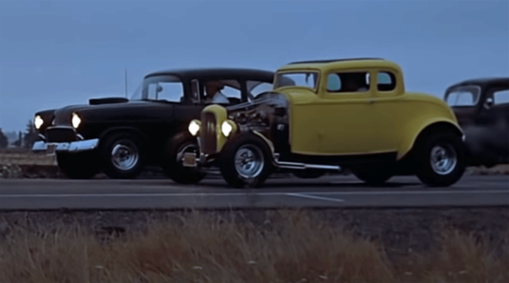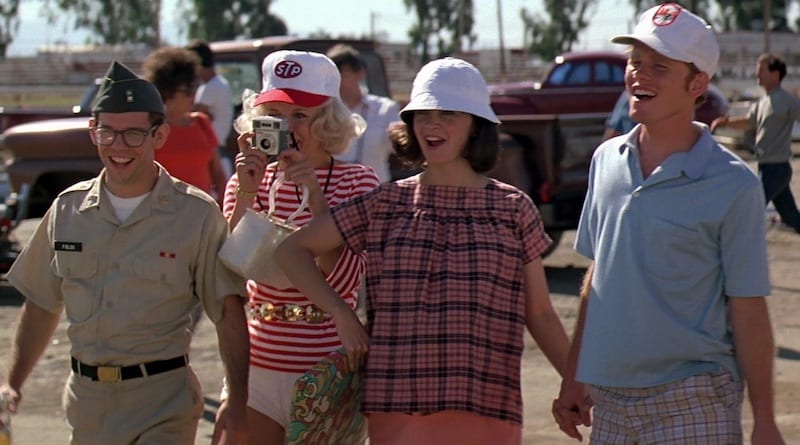 โ€œ…. It was George Lucas who came up with the idea to film each of the four segments in a different visual style. 1964 is filmed to look like a 1950โ€™s drag-racing film with a wide angle, 1965โ€™s Vietnam sequences were shot in 16mm harkening back to the visuals from the television reports of the time. The psychedelia of 1966 was echoed in the split-screen technique borrowed from films like Woodstock and Elvis on Tour and the student demonstrations of the 1967 segment were shown in a style borrowed from student rebellion films of the late 1960s. I think this technique works as it makes it very easy to differentiate between the segments and reinforces the feeling of getting four distinct storiesโ€ฆโ€